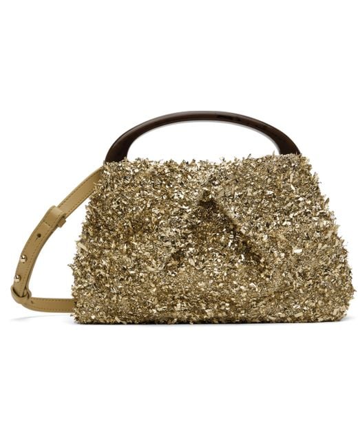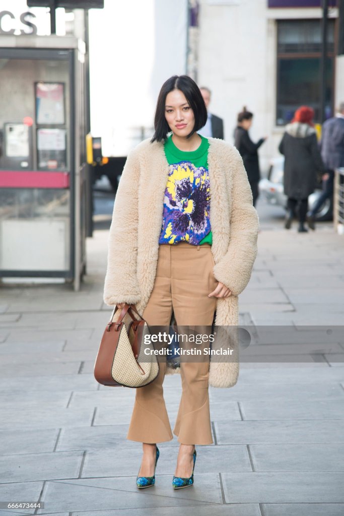 TIFFANY HSU IS WEARING A BEIGE FUR COAT, THAT SHE PAIRED OVER A GREEN FLORAL PRINT BLUE AND YELLOW SWEATER. SHE BROWN BELL-BOTTOM CROPPED PANTS AND BLACK AND BLUE FLORAL PRINT PUMPS. FOR HER ACCESSORIES SHE PAIRED A BROWN LEATHER BEIGE WOOVEN HANDBAG.