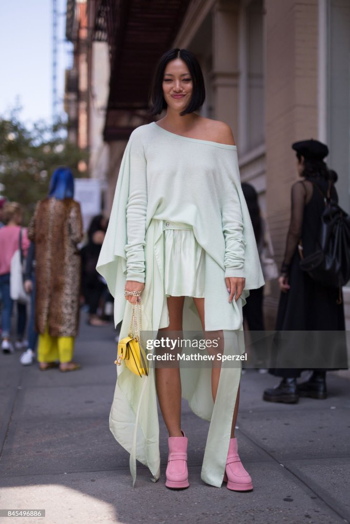 TIFFANY HSU IS WEARING A LAYERED LONG-SLEEVE PASTEL GREEN DRESS THAT SHE PAIRED WITH PINK BOOTIES. MY FAVORITE ASPECT OF THIS OUTFIT WOULD HAVE TO BE THE PINK VINTAGE STYLE PLATFORM BOOTS. THEIR SO UNIQUE AND BEYOND CHIC, AND I LOVE HOW IT DRAWS EMPHASIS TO THE SOFTNESS OF THE GREEN. WHILE ADDING THE RIGHT AMOUNT OF DETAIL AND COLOR TO THE OUTFIT. SO, I DECIDED TO RECREATE A GREEN DRESS PAIRED WITH VERY BOLD DETAILED SHOES.