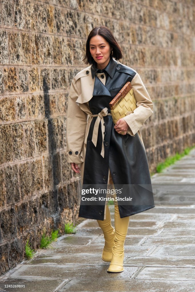 TIFFANY HSU IS WEARING BLACK AND TAN COLOR-BLOCK BELTED LEATHER TRENCH COAT THAT SHE PAIRED WITH SOFT YELLOW KNEE HIGH BOOTS AND A SOFT YELLOW VINTAGE WOODEN, WOOVEN CLUTCH BAG. FOR HER JEWLERY SHE PAIRED GOLD HOOP EARRINGS.