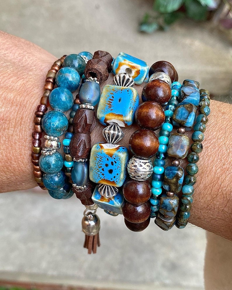 FOR THE REST OF THE ACCESSORIES AND JEWELRY, I PAIRED A METALLIC BLUE HANDBAG WITH BRIGHT SKY-BLUE NAILS. ALONG WITH THE EARRINGS I PAIRED AN INDIGO BLUE CHUNKY STONE RING WITH ETSY TURQUOISE STONE BEAD BRACELETS ON ONE HAND. ON THE OTHER HAND, I PAIRED ETSY BLUE AND BROWN BOHO BEAD BRACELETS TO FINISH THE LOOK OFF.