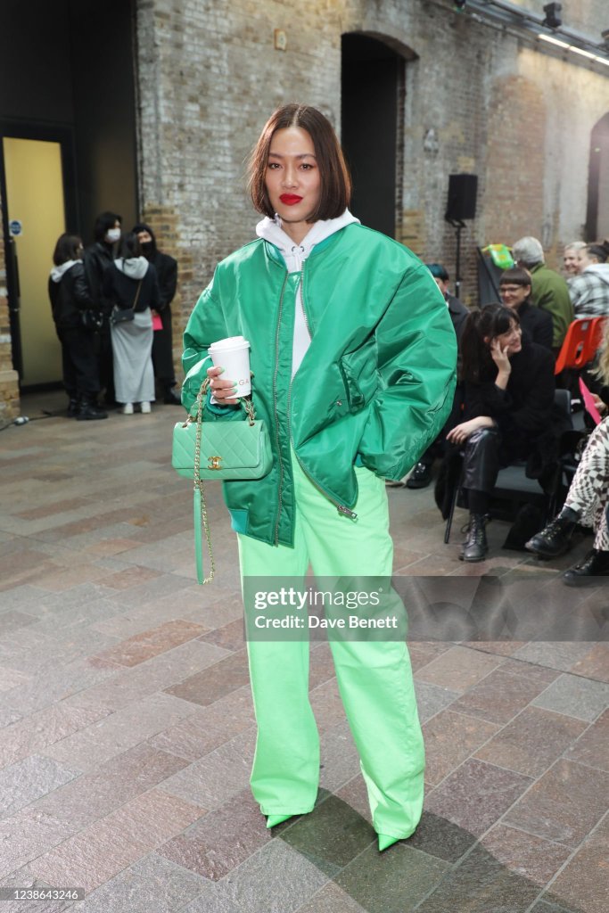 TIFFANY HSU IS WEARING A BAGGY GREEN BOMBER JACKET SHE HAS PAIRED OVER A WHITE HOODIE PAIRED OPEN, WITH MINT GREEN PANTS AND MATCHING MINT GREEN PUMPS. FOR HER ACCESSORIES AND JEWELRY, SHE PAIRED A PASTEL GREEN CHANEL BAG, WITH GREEN ACYLIC NAILS, AND FOR A POP OF CONTRASTING COLOR, SHE PAIRED HER OUTFIT, WITH A BOLD RED LIP. I DECIDED TO RECREATE THE ASPECT OF HER BOMBER JACKET AND THE THEME OF GREEN BY LAYERING DIFFRENT HUES OF GREEN IN MY OWN WAY.