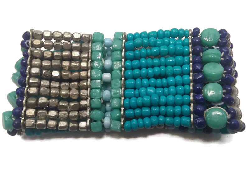 FOR THE REST OF THE ACCESSORIES AND JEWELRY, I PAIRED MCM, BLUE CUTOUT HANDLE BAG, BLUE NAILS, WITH ETSY TWO-TONE BLUE STONE, BEAD, STRETCH CUFF BRACELET, ON ONE HAND. I PAIRED BLUE MARBLE STONE BRACELETS STACK, ON THE OTHER HAND.