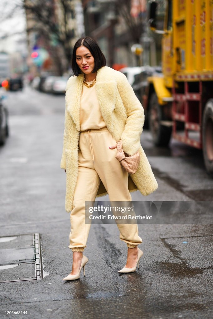 TIFFANY HSU IS WEARING A YELLOW FUR COAT THAT SHE PAIRED OVER A PASTEL YELLOW SWEATSHIRT WITH MATCHING JOGGER SWEATPANTS, THAT SHE PAIRED WITH BEIGE PUMPS. TARA 101: SO, FOR ME ITS THE FUR COAT THATS GIVING ME NEWYORK STREET STYLE VIBES. I LIKE HOW SHE COMFORTABLY, AND CASUALLY, PAIRED AROUND WITH IT. SO I DECIDED, TO RECREATE THIS LOOK, OF THE FUR COAT, PAIRED WITH THE SWEATSHIRT, AND MATCHING SWEATPANTS.