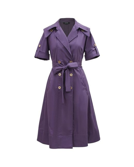 EMILI SINDLEV PAIRED BLACK OPTICAL FRAMES, PAIRED WITH A PURPLE OFF-THE-SHOULDER CARGO DRESS. THAT SHE PAIRED WITH RED SATIN PUMPS, AND A BEIGE HANDBAG.