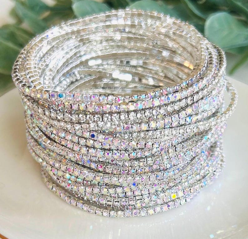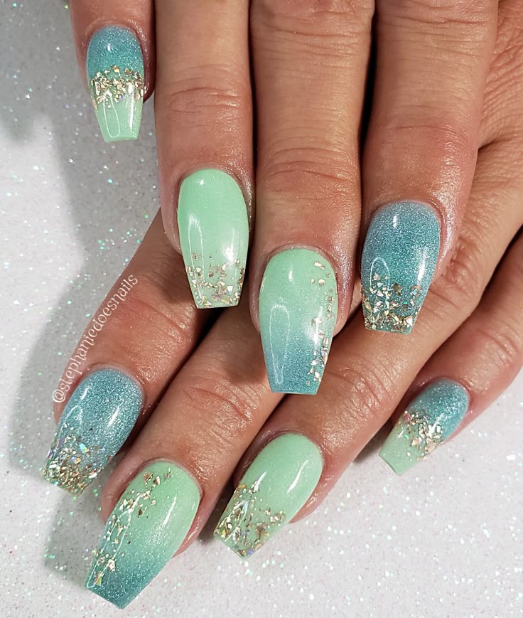 FOR THE REST OF THE JEWELRY, AND ACCESSORIES, I PAIRED MINT-GREEN OMBRE NAILS, WITH ETSY BLUE MARBLE-STONE CUFF BRACELET, PAIRED WITH SILVER-IRIDESCENT CRYSTAL STACKED BRACELETS, ON ONE HAND. ON THE OTHER HAND, I PAIRED AN IRIDESCENT BLUE MARBLE MULTI-STONE BRACELET.