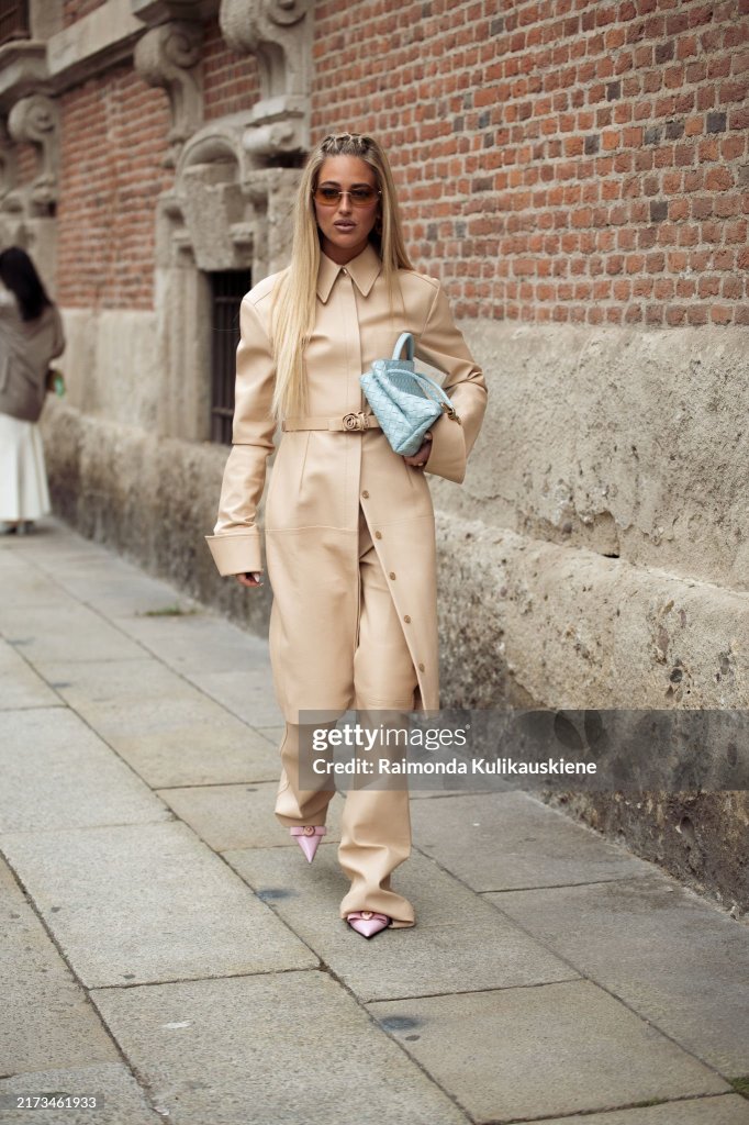 EMILI SINDLEV IS WEARING BROWN SHADES, THAT SHE PAIRED WITH A BEIGE PATENT LEATHER COAT, PAIRED WITH A BEIGE LOGO BELT, AROUND THE COAT, PAIRED WITH MATCHING BEIGE LEATHER PANTS, AND PINK BOW PUMPS. FOR HER ACCESSORIES, SHE PAIRED A MINT-GREEN WOOVEN LEATHER HANDBAG.