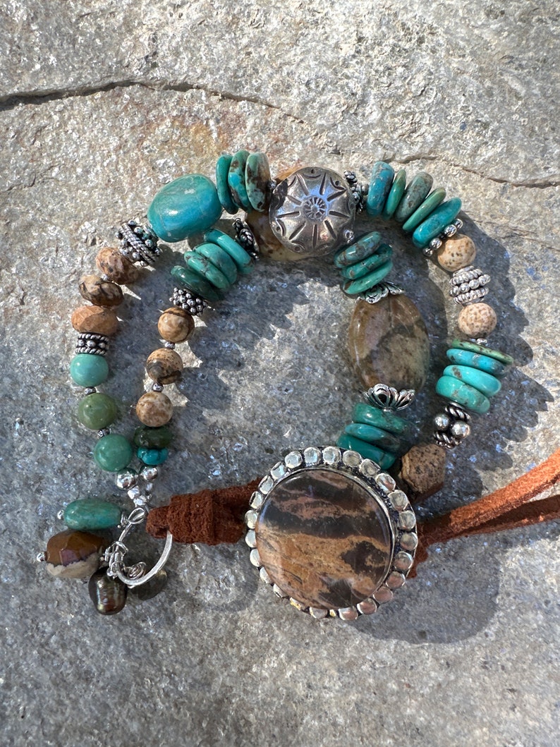 FOR THE REST OF THE ACCESSORIES AND JEWELRY, I A PAIRED A SKY-BLUE LEATHER HANDLE-BAG, WITH ETSY, INDIGENOUS TURQUOSIE BEAD STONE BRACELETS, PAIRED WITH ETSY, TEAL-BLUE BEAD STONE BRACELTS ON ONE HAND. AND ON THE OTHER HAND, I PAIRED ETSY OMBRE BLUE AND TURQUOISE-BLUE MARBLE-STONE BRACELETS.