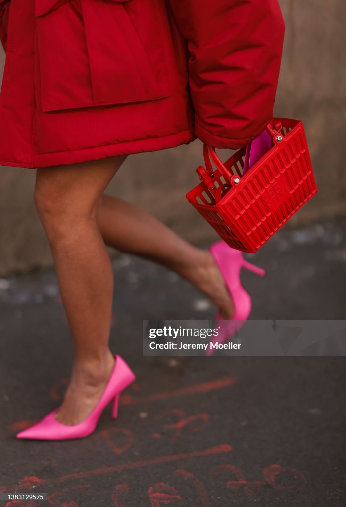 TIFFANY PAIRED A RED COAT LIKE A DRESS WITH BRIGHT NEON PINK PUMPS AND A BRIGHT RED BASKET HANDBAG.