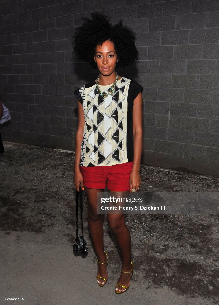 TARA 101: SOLANGE KNOWLES PAIRED A BLACK AND CREAM GEOMETRIC TOP, WITH RED SHORTS THAT SHE PAIRED WITH METALLIC GOLD STRAPPY-SANDALS. FOR HER ACCESSORIES AND JEWELRY, SHE CHOSE RETO VINTAGE. SHE PAIRED A BROWN TURQUOISE AND GOLD MOSAIC ACRYLIC NECKLACE WITH SILVER CHUNKY CRYSTAL RINGS, AND SHE FINISHED THE LOOK OFF, WITH A CAMERA STRAP WORN AS A BAG OF AN ACCESSORY.