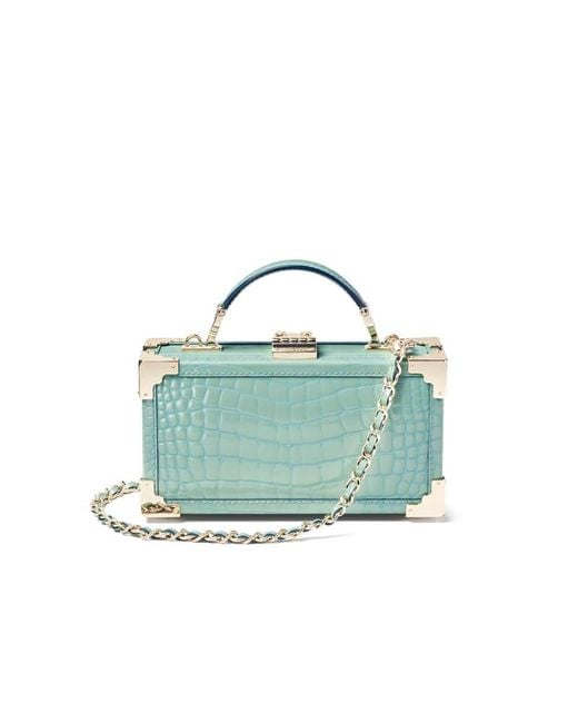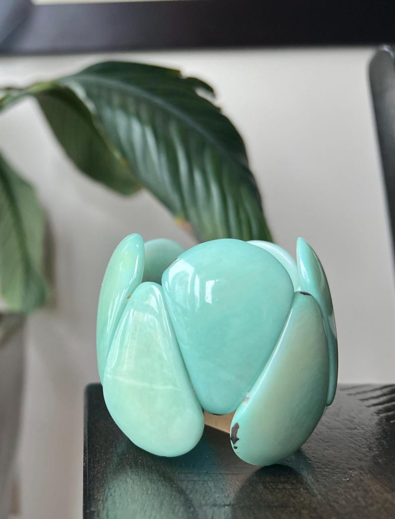 FOR THE REST OF THE ACCESSORIES, AND JEWELRY, I PAIRED A MINT-GREEN CROC-EFFECT, MINI BOX TRUNK BAG, PAIRED WITH MINT-GREEN ACRYLIC NAILS, WITH AN ETSY, VINTAGE RETRO MINT-GREEN STRETCH CUFF BRACELET, ON ONE HAND.