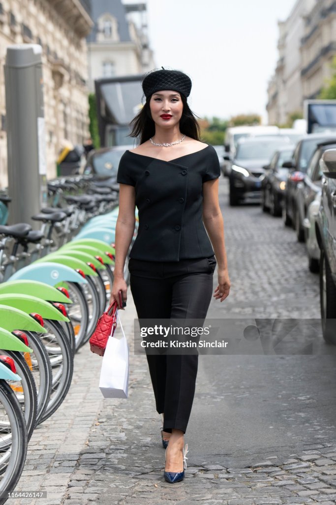 NICOLE WARNE PAIRED A BLACK QUILTED VEIL BERET, WITH A BLACK DOUBLE-BREASTED TOP,THAT HAS A VERY WIDE NECKLINE, THAT MAKES THE TOP LOOKS LIKE IT IS HANGING OFF-THE- SHOULDERS. SHE PAIRED BLACK TROUSERS, AND NAVY BLUE PATENT PUMPS. SHE ACCESSORIZED HER LOOK, WITH A RED HANDBAG. A WHITE SHOPPING BAG, AND MATCHING BOLD RED LIPSTICK. FOR HER JEWELRY, SHE PAIRED A SILVER NECKLACE.