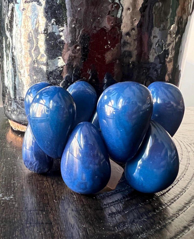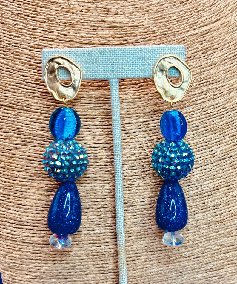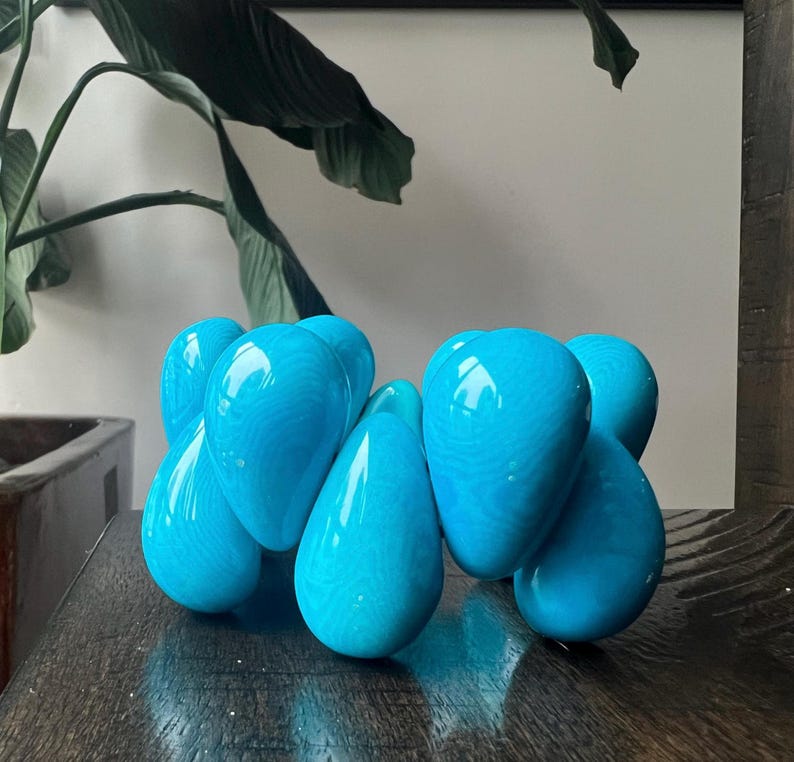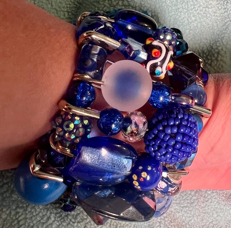 FOR THE REST OF THE ACCESSORIES, AND JEWELRY, I PAIRED A SILVER CRYSTAL-EMBELLISHED CLUTCH, WITH BRIGHT-BLUE ACRYLIC NAILS AN ETSY, VINTAGE DARK-BLUE GEOMETRIC CUFF BRACELET, PAIRED WITH AN ETSY, DARK-BLUE STONE AND BEAD, CHUNKY CUFF BRACELET ON ONE HAND. I PAIRED AN ETSY, VINTAGE TURQUOISE-BLUE GEOMETRIC CUFF BRACELET, ON THE OTHER HAND.
