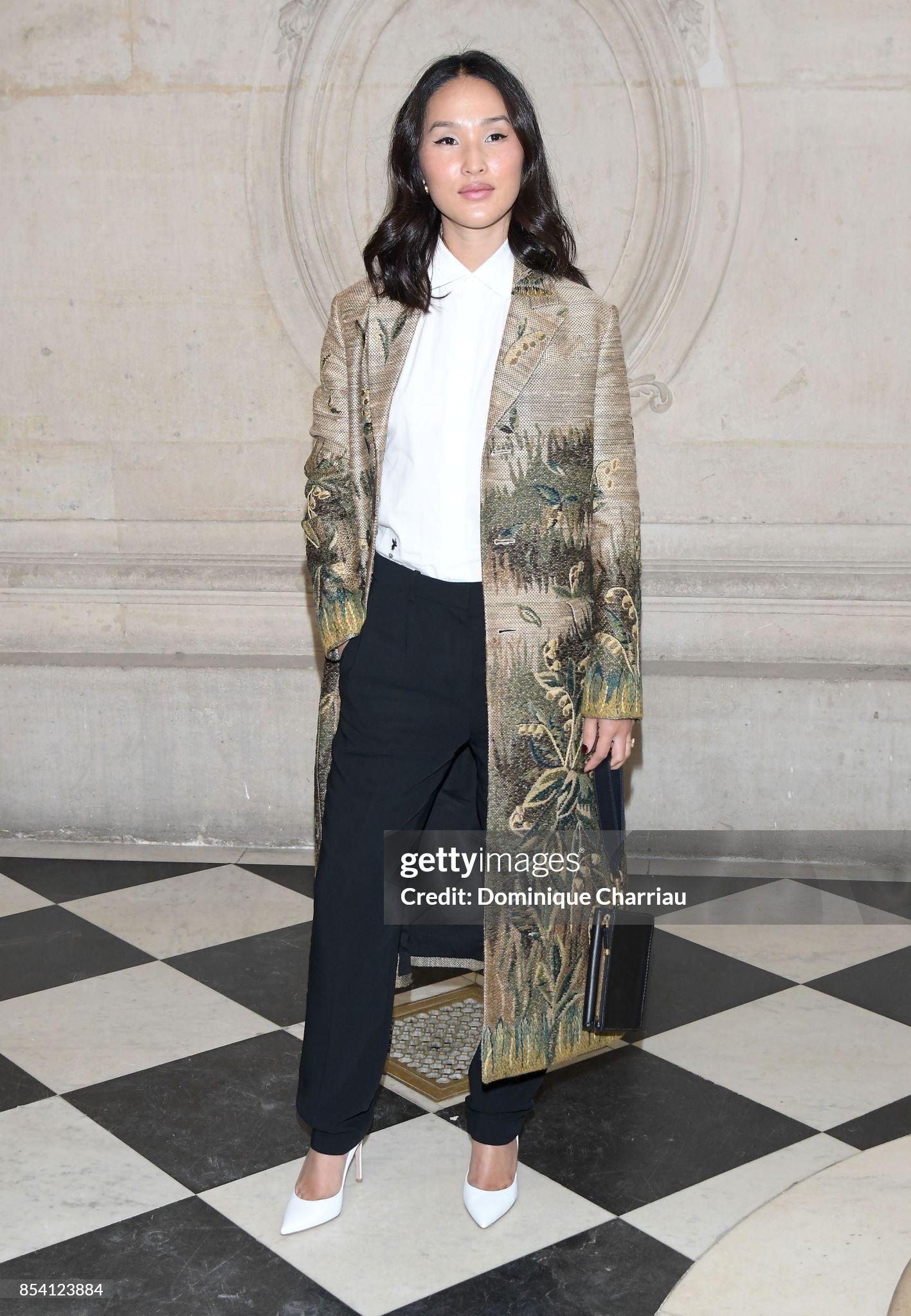 NICOLE WARNE PAIRED A GREEN FLORAL EMBROIDERED FLORAL JACQUARD BROCADE COAT WITH A WHITE COLLARED SHIRT TUCKED INTO BLACK TROUSERS AND WHITE PUMPS. FOR HER ACCESSORIES SHE PAIRED A BLACK LEATHER TRUNK WRIST-LET CLUTCH BAG AND PEARL EARRINGS.
