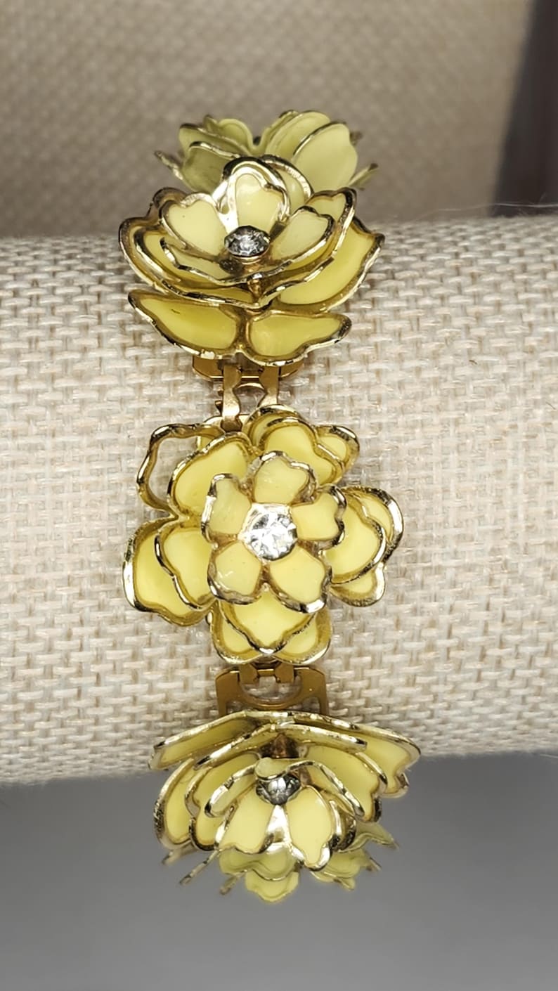 FOR THE REST OF THE ACCESSORIES, AND JEWELRY, I PAIRED BARBIE-PINK CHROME NAILS, WITH AN ETSY VINTAGE, YELLOW FLORAL ENAMEL CUFF BRACELET.