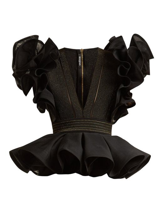 balmain-BLACK-GOLD-Ruffle-sleeved-Peplum-hem-Stretch-knit-Top