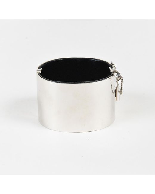 celine-Silver-Silver-Tone-Black-Leather-Chain-Accented-Hinged-edge-Bracelet-Sz-M