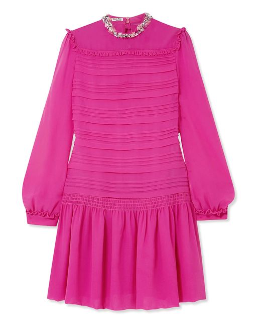 miu-miu-fuchsia-Embellished-Silk-chiffon-Mini-Dress