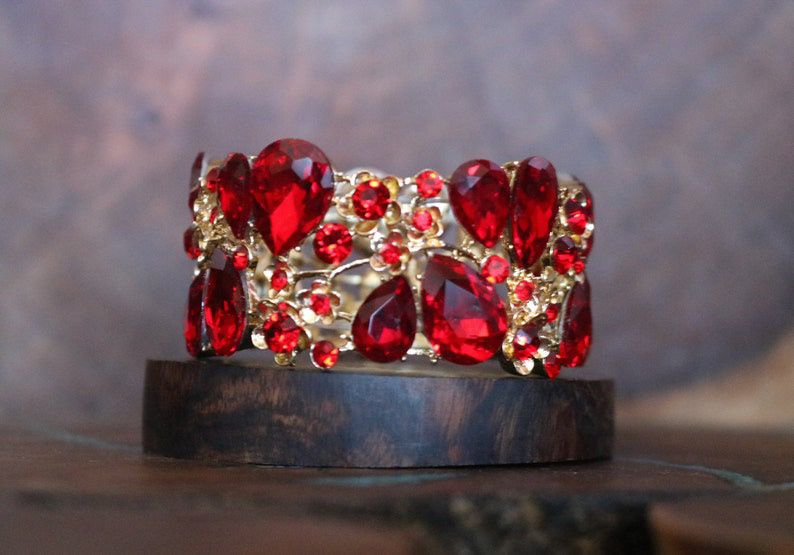 FOR THE ACCESSORIES, I PAIRED, BARBIE BABY-PINK NAILS, WITH A PINK CRYSTAL MICROPHONE. FOR THE REST, OF THE JEWELRY, I PAIRED ETSY HOOKANDKNOBDESIGN, METALLIC PEARLESCENT CRYSTAL, STACKED BRACELETS. AND ON THE OTHER HAND, TO REALLY BRING PRINTS, EMBELLISHMENTS, AND COLORS TOGETHER, I PAIRED AN ETSY, KANDIGEMSBOUTIQUE, RED CRYSTAL BRACELETS.
