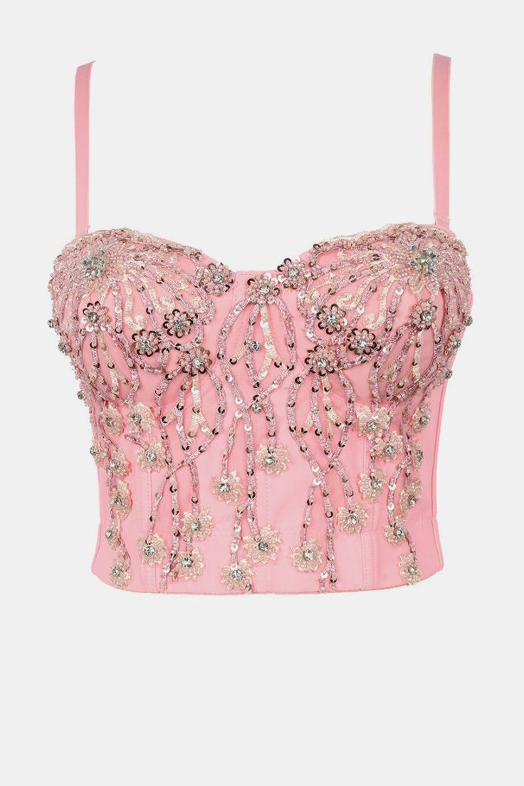 THIS IS ONE, OF MY MANY FAVORITE BUSTIERS, ASHELENIAH QUINTANILLAHAH, IS WEARING, BECAUSE IT LOOKS, LIKE IT IS BEDAZZLED IN CRYSTALS, BEADS, AND SEQUINS. SO, I HAD TO RECREATE THE LOOK. I PAIRED A PEARL EMBELLISHED HAT, WITH POWDER BABY-PINK LIPSTICK, ETSY AREXRODECREATIONS, PINK PEARLESCENT CHANDELIER EARRINGS WITH A TOM FORD, LAVENDER-SILVER SEQUINED TOP, PAIRED UNDERNEATH A CRYSTAL BEDAZZLED IN GOLD, BUSTIER. THAT I PAIRED, WITH BOYFRIEND JEANS, AND WHITE AND BLACK, EMBELLISHED, FENDI LOGO BOOTS.