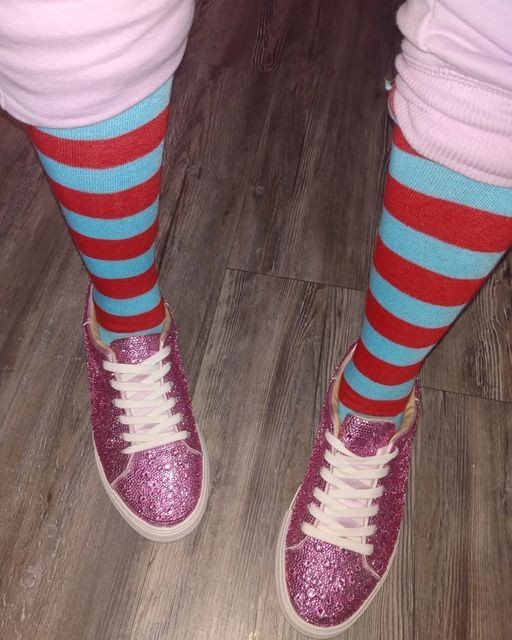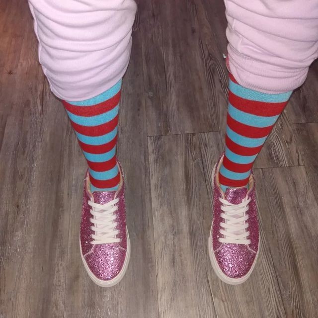 SO PICTURED ABOVE, I HAVE ON PINK JOGGERS, THAT I PAIRED WITH BLUE AND RED, CANDY CANE-STRIPED KNEE-HIGH SOCKS, THAT I PAIRED, WITH BARBIE PINK, CRYSTAL, DESIGNER SNEAKER PLATFORMS.