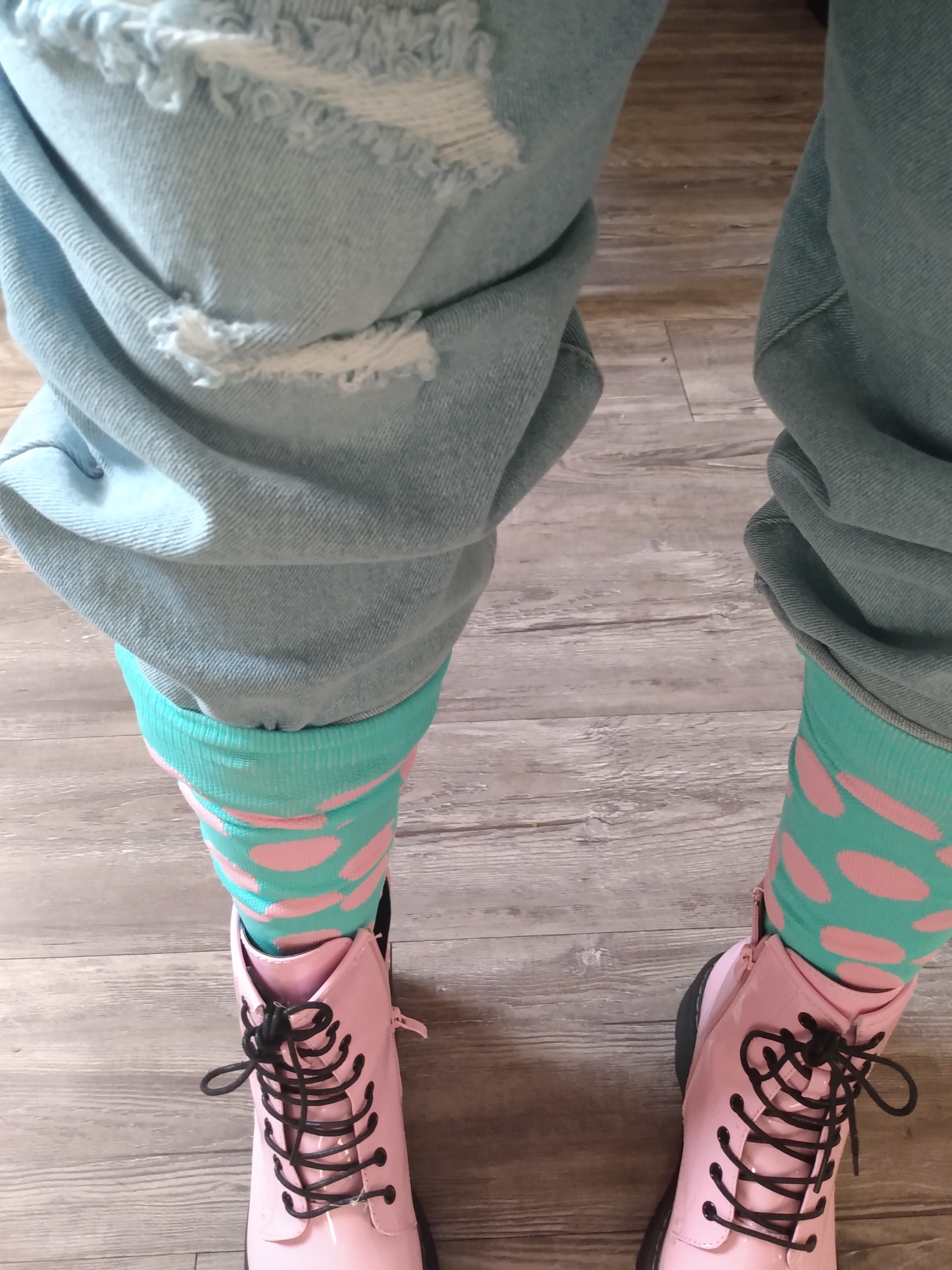 SO MANY VERSATILE WAYS, TO STYLE BOYFRIEND JEANS, IT JUJST HAS, THE TENDENCY, TO BRING THE TOMBOY EDGINESS, OUT OF YOU. THE TOMBOY EDGINESS I FELT AT 13. AND THAT IS WHAT I LOVE, ABOUT THEM. SO PICTURED ABOVE, I HAVE LIGHT WASH, DISTRESSED DENIM JEANS, THAT I STYLED, WITH BLUE AND PINK, POLKA DOT, KNEE HIGH SOCKS, AND BARBIE-PINK COMBAT BOOTS. I LOVE HOW THE DETAIL, OF THESE DISTRESSED JEANS, JUST SLAP YOU, IN THE FACE, LIKE BAM! IM HERE! AND IM READY TO SLAY! WITH THE COMBAT BOOTS. SO HERE’S SOME ADVICE: