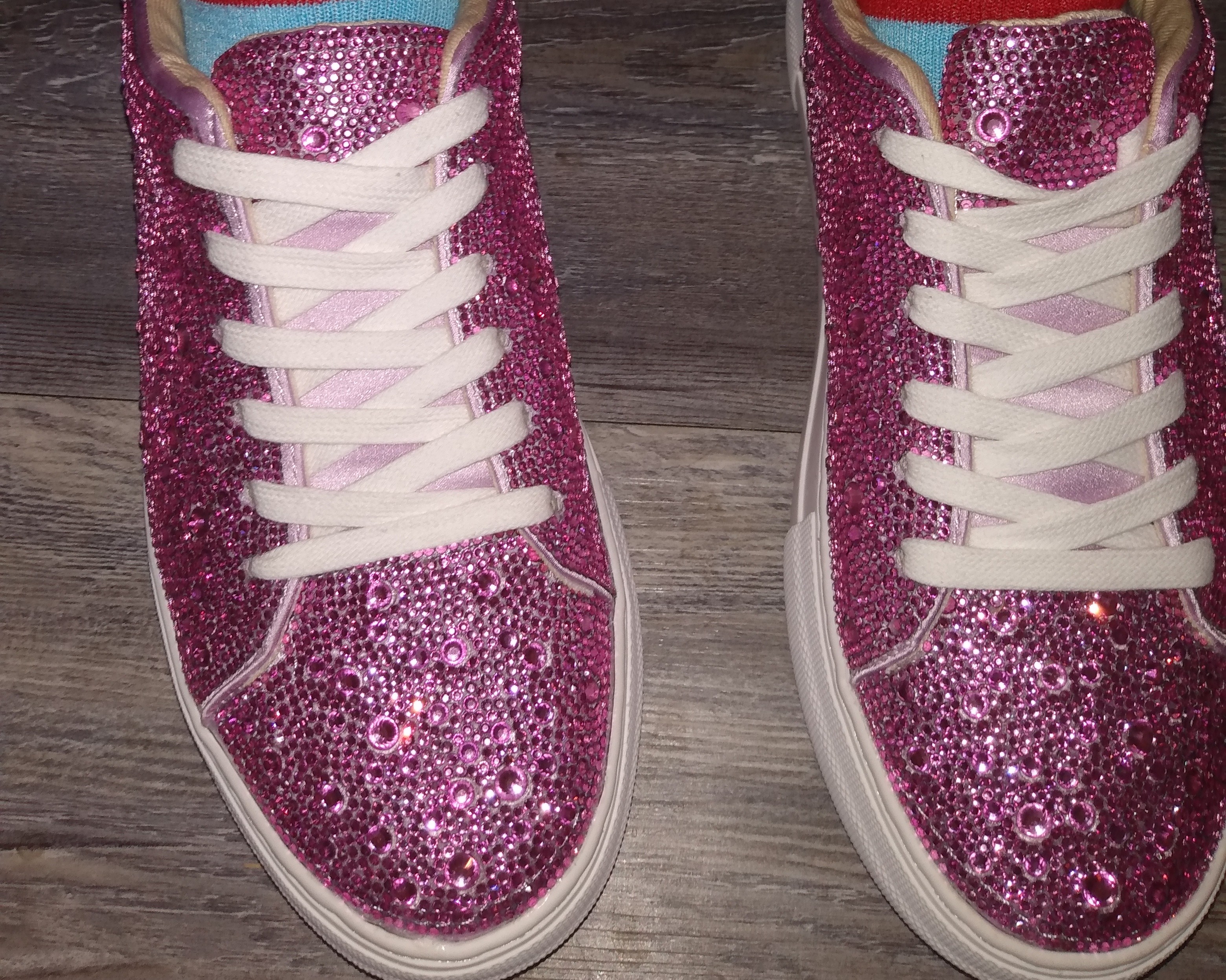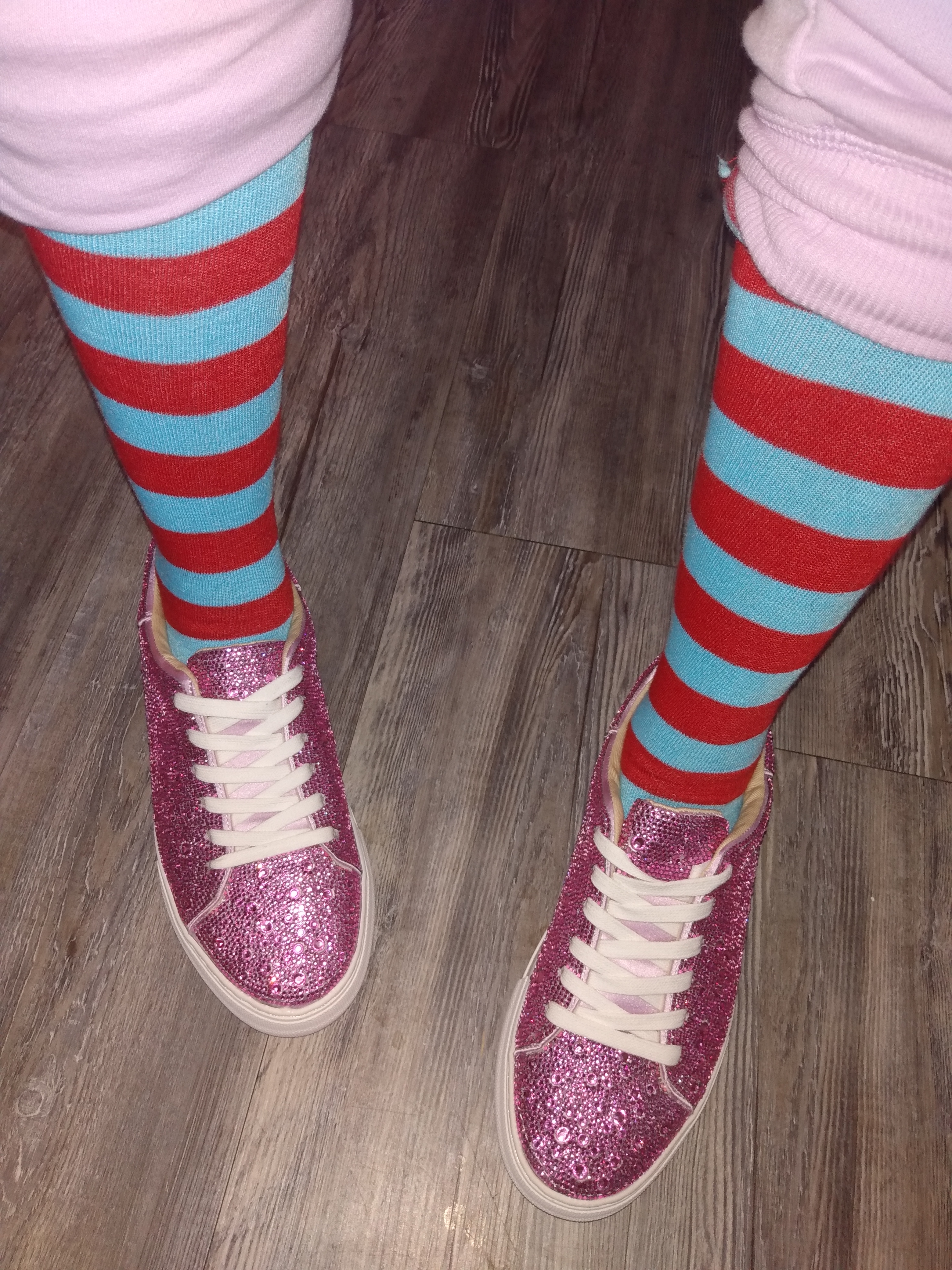 PICTURED ABOVE, I HAVE ON WHAT I CALL MY BARBIE PINK, JELLY GLASSES, THAT I MATCHED WITH MY BETSY JOHNSON, CRYSTAL SNEAKERS. I PLAYED OFF, THE VERY DEEP PIGMENTED HUE, OF MY GLASSES, WHEN CHOOSING MY SOCKS. I FOUND RED AND BLUE, TO BE TWO COMPLIMENTARY COLORS, WITH MY GLASSES.