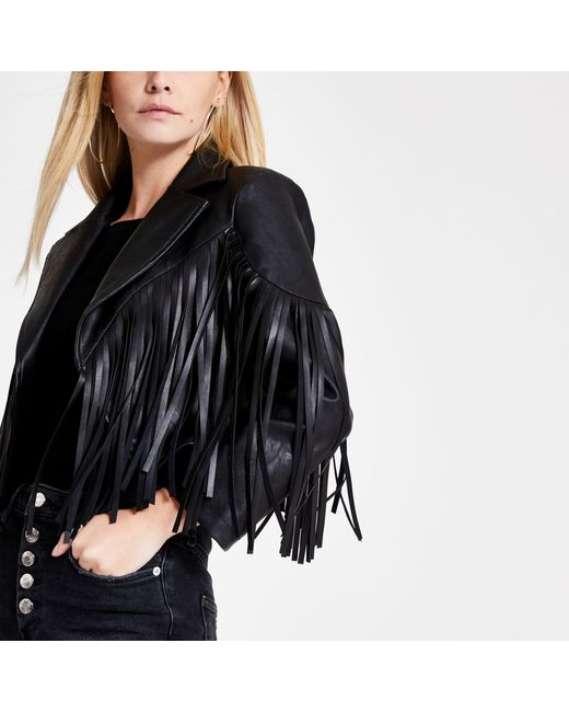 river-island-Black-Petite-Faux-Leather-Fringe-Crop-Jacket
