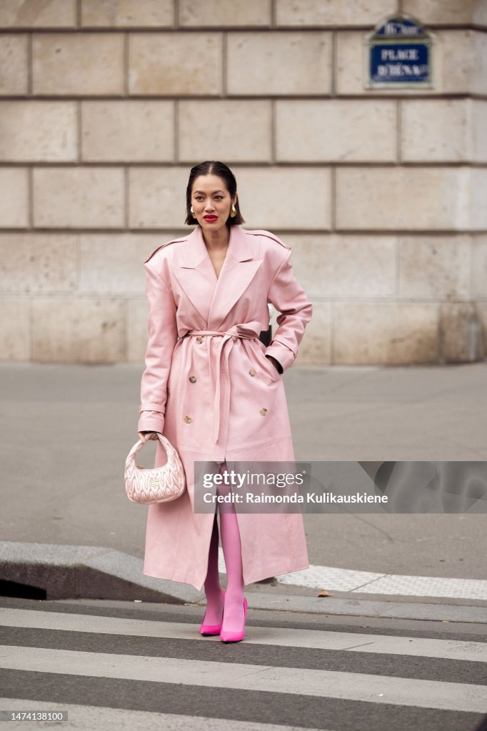 TARA 101: MY FAVORITE ASPECT OF THIS OUTFIT, WOULD HAVE TO BE HOW SHE PLAYS WITH SEVERAL DIFFERENT SHADES OF PINK. I LIKE HOW SHE PAIRED HER LIGHT BARBIE-PINK COAT WITH HER MIU MIU LIGHT BARBIE-PINK HANDBAG. AND I LOVE HOW SHE TAKES THE OUTFIT TO NEW HEIGHTS, BY PARING BRIGHT BARBIE-PINK TIGHTS WITH HER OUTFIT, AND MATCHING BARBIE-PINK PUMPS. I LOVE HOW THE GOLD CHANDELIER EARRINGS BRINGS ALL THE PINKS: SPFT AND MORE PIGMENTED, AND BLENDS THEM IN HARMONY. SO, I DECIDED TO RECREATE THE BARBIE-CORE, PRETTY IN PINK LOOK, OF THE COAT, AND PUMPS.