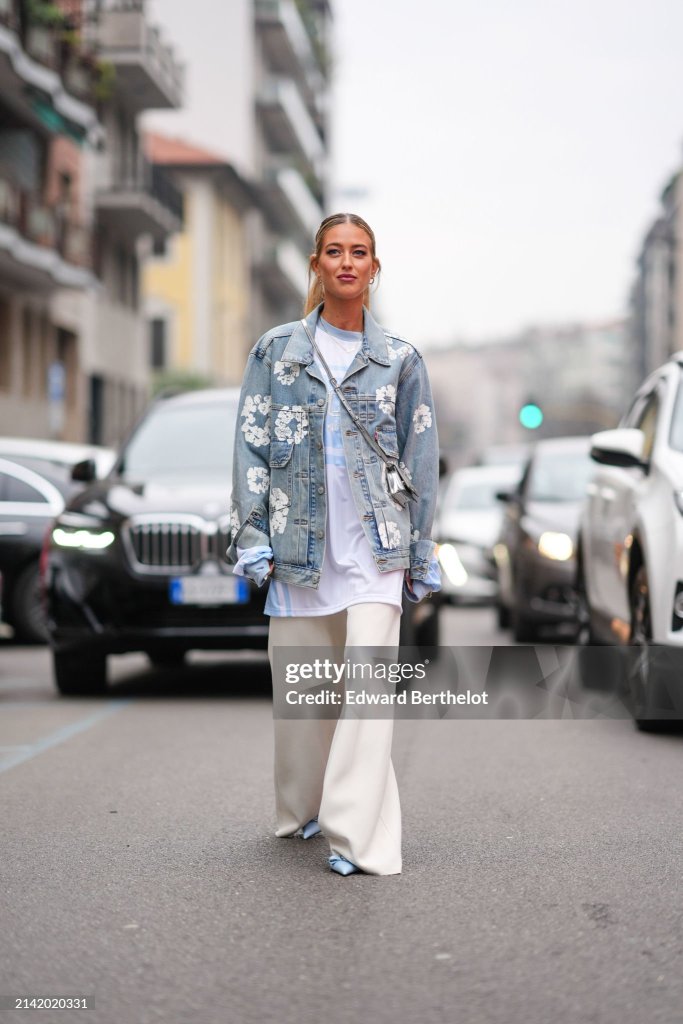 EMILI SINDLEV PAIRED A DENIM JACKET WITH A WHITE FLORAL-PRINT PAIRED WITH WHITE AND BLUE GRAPHIC NUMBER LONG SLEEVE SHIRT, THAT SHE PAIRED WITH CREAM WIDE-LEG PANTS, PAIRED WITH BLUE PATENT POINTED-TOE PUMPS, AND A SILVER CROSS-BODY MINI HANDBAG.