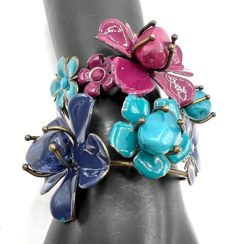FOR THE REST OF THE ACCESSORIES, AND THE JEWELRY, I PAIRED BARBIE-PINK NAILS, WITH A PURPLE MARC JACOBS CROSSBODY BAG, WITH ETSY BLUE, PURPLE AND PINK FLORAL CUFF BRACELET, ON ONE HAND. I PAIRED A GOLD CUFF BRACELET, WITH MULTI-COLORED JEWELS ON THE OTHER HAND.