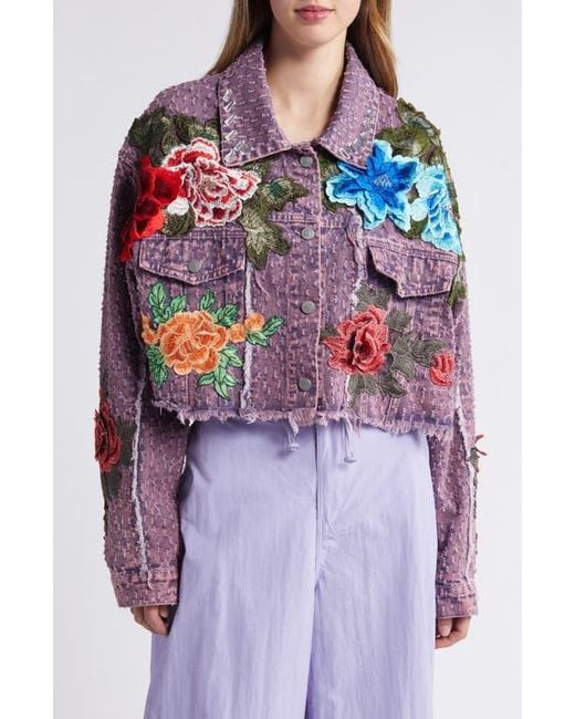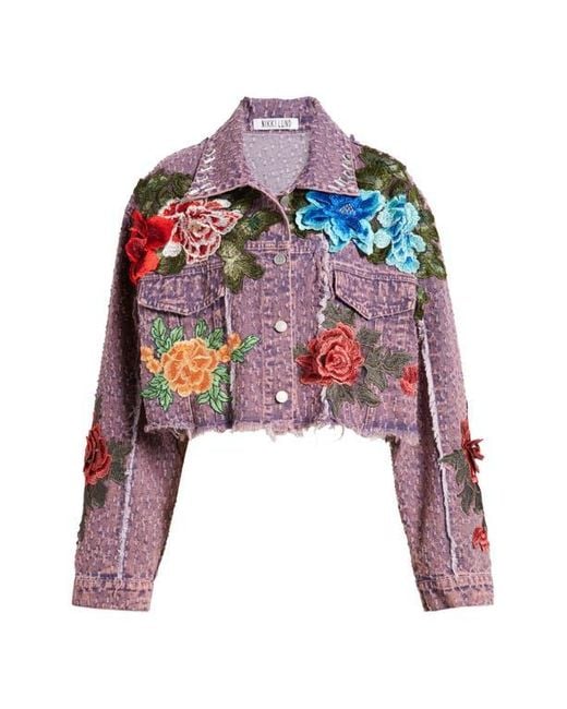 I PAIRED BLUE OPTICAL GLASSES, WITH BARBIE FUCHSIA-PINK LIPSTICK, PAIRED WITH ETSY VINTAGE PURPLE RETRO CHANDELIER EARRINGS, THAT I PAIRED WITH NIKKI LUND, PURPLE MULTI-COLOR FLORAL TEXTURE DENIM JACKET. AND I PAIRED THE CLOSED JACKET OVER A PINKO, PINK LONG BUTTON-DOWN SHIRT WITH A BLUE BELT TIED AND TUCKED IN A KNOT AROUND THE JACKET, AND THE PINK SHIRT, THAT WILL BE TUCKED INTO, DOLCE AND GABBANA, PINK DENIM WASHED HIGH-WAISTED JEANS. I PAIRED PINK TIGHTS, UNDERNEATH PURPLE SATIN PLATFORM ANKLE-STRAP PUMPS.