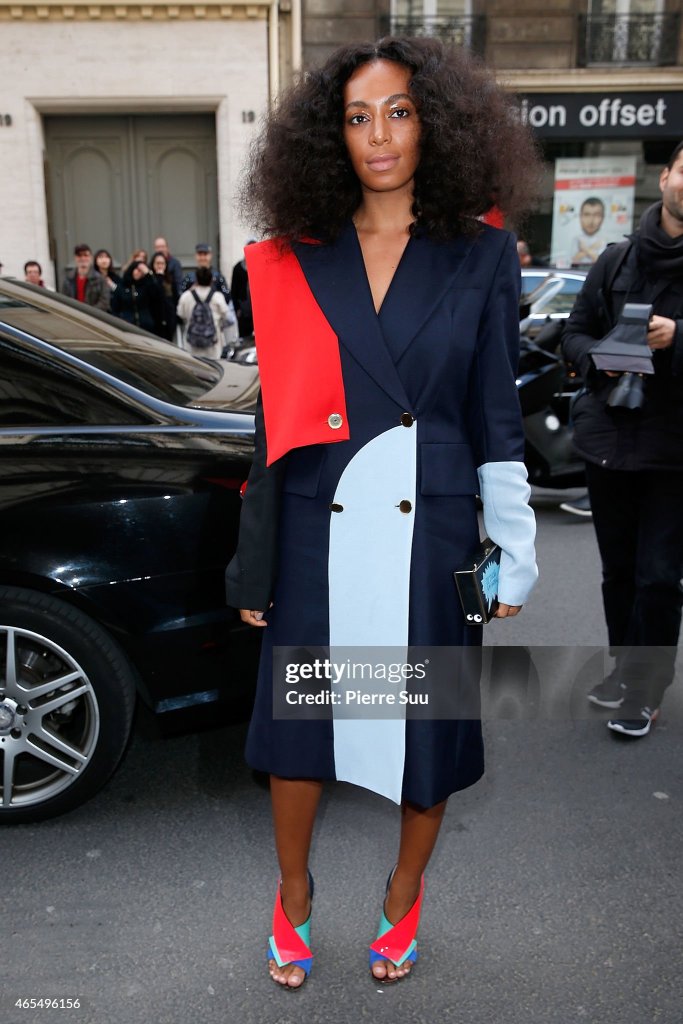 SOLANGE KNOWLES IS WEARING A WHITE SILK BLOUSE, THAT HAS TUCKED INTO A YELLOW BROCADE MINI SKIRT. THAT SHE HAS PAIRED WITH ORANGE SUEDE, BUCKLE ROUND-TOE PUMPS. SHE ACCESSORIZED HER OUTFIT, WITH GOLD AND SILVER CHUNKY RINGS ON ONE HAND.