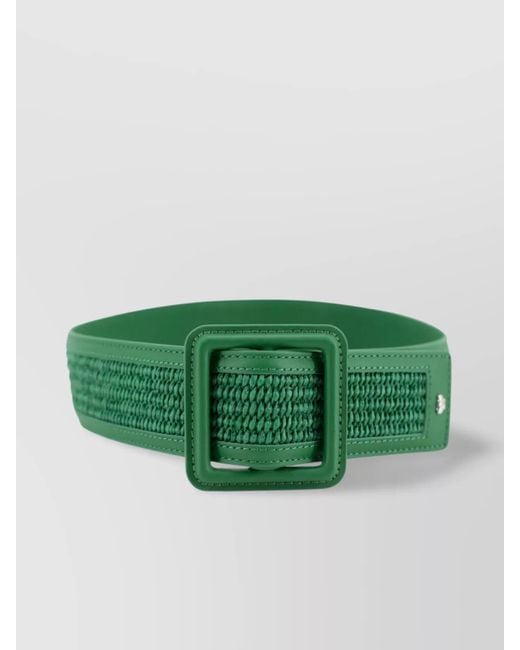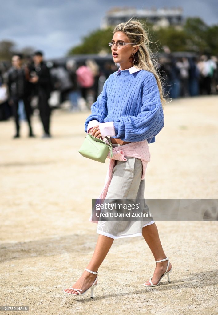 EMILI PAIRED BEIGE RECTANGLE OPTICAL FRAMES, WITH A CHUNKY LOEWE BLUE CABLE-KNIT SWEATER, THAT SHE PAIRED OVER A WHITE BUTTON-UP COLLARED SHIRT. SHE PAIRED HER OUTFIT WITH BEIGE LOEWE SHORTS, PAIRED WITH A LOEWE PINK CABLE KNIT SWEATER, TIED AROUND THE SHORTS, WITH WHITE ANKLE-STRAP SANDALS HEELS, AND A MINT GREEN LOEWE MINI HANDBAG. SHE PAIRED HER OUTFIT WITH BROWN CHANEL LOGO CHANDELIER EARRINGS.