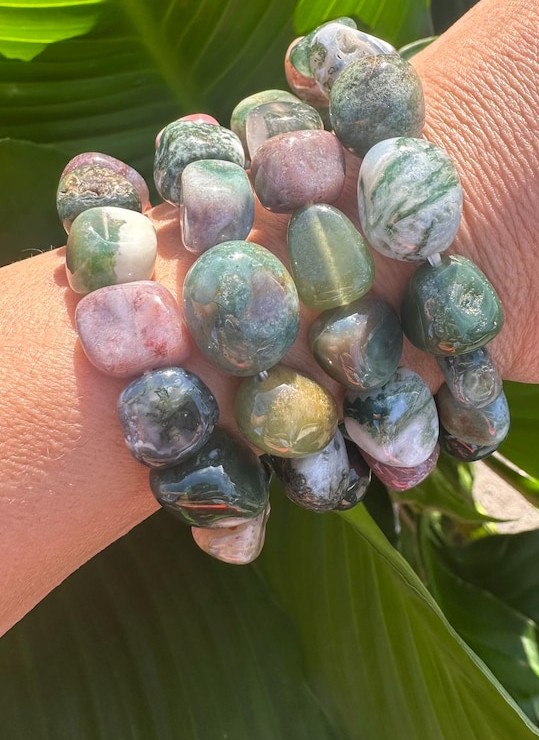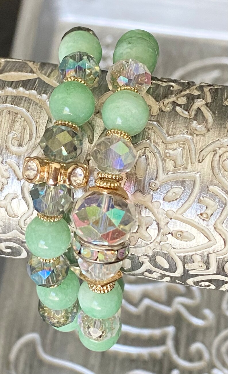 FOR THE REST OF THE JEWELRY, AND ACCESSORIES, I PAIRED BARBIE HOT-PINK NAILS, WITH AN ETSY MINT-GREEN CRYSTAL, AND IRIDESCENT-OPAL BEAD BRACELETS ON ONE HAND. I PAIRED AN ETSY MINT-GREEN, AND NEUTRAL MULTI-COLOR ROCK-STONE BRACELETS STACK, ON THE OTHER HAND.