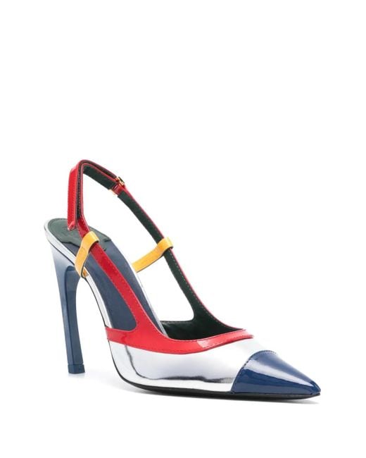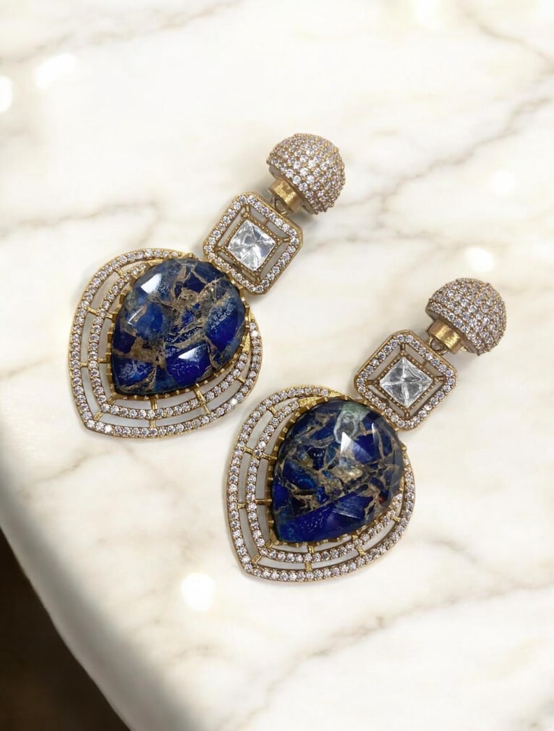I PAIRED ETSY ORANGE-OPAL CHANDELIER EARRINGS, WITH BARBIE-PINK LIPSTICK, PAIRED WITH A PENNY BLACK, BLUE BLAZER PAIRED OPEN, OVER A PATOU, BLUE BLOUSE THAT WILL BE TUCKED INTO A GUCCI, BLUE SILK-PRINTED SKIRT, BLUE TIGHTS, WITH ORANGE AND WHITE COLOR-BLOCK PUMPS.