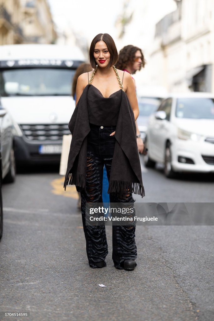 TIFFANY HSU PAIRED A GOLD CHAIN, BLACK FRINGED HALTER NECK TOP, WITH BLACK DISTRESSED BAGGY JEANS, AND BLACK BOOTS. SHE ACCESSORIZED HER LOOK, WITH BRIGHT RED LIPSTICK, FOR A POP OF COLOR.