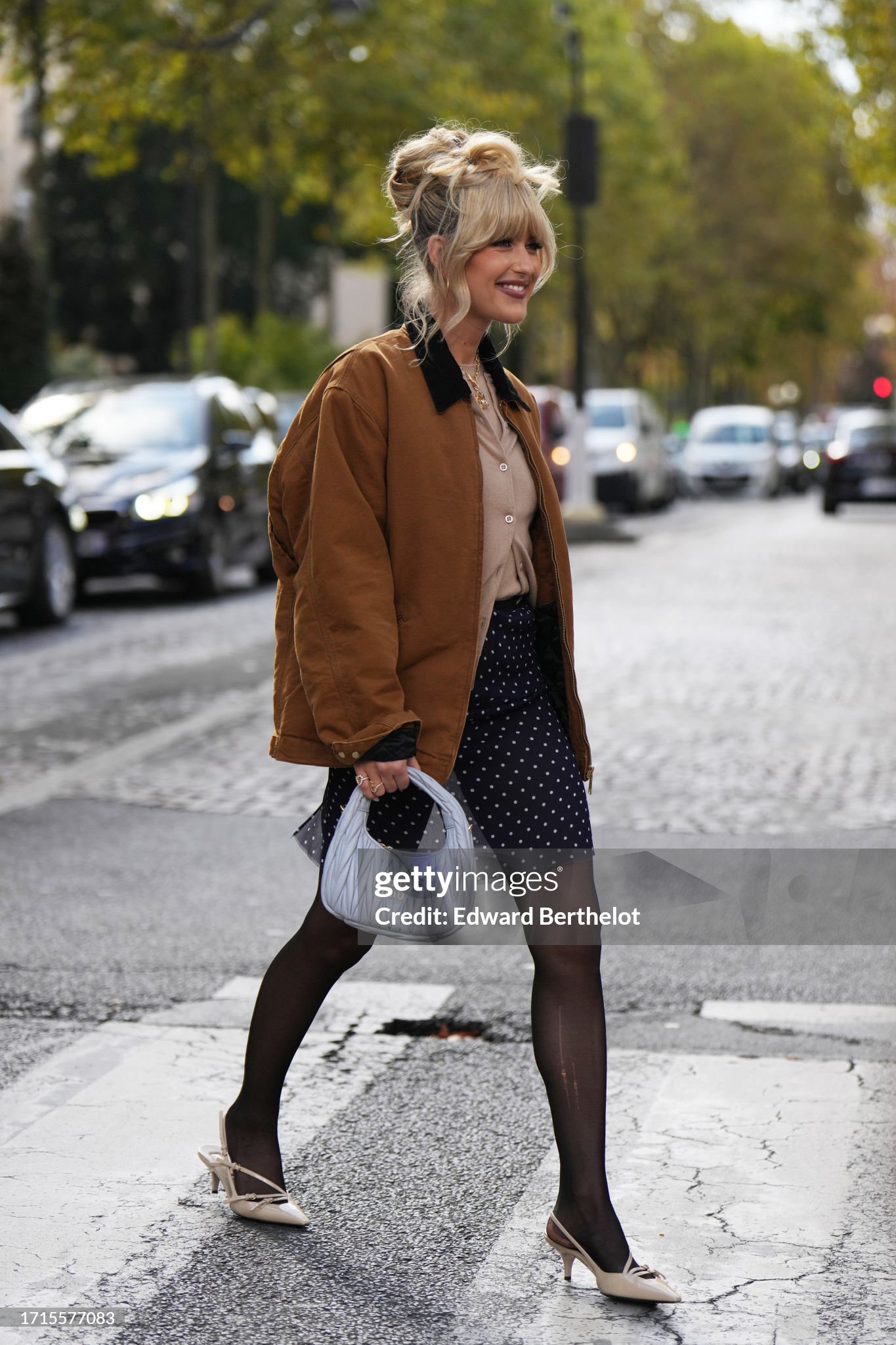 THIS OUTFIT OF EMILI SINDLEV IS SIMPLY ONE OF MY FAVORITE BECAUSE OF THE CREATIVE WAY SHE DRESSED UP OF MY FAVORITE PRINTS OF ALL TIME POLKA DOT PRINT. LET’S DISCUSS MORE IN DEPTH OF WHAT SHE IS WEARING. EMILI SINDLEV IS WEARING A BRIWN BOMBER JACKET OVER A BROWN TOP PAIRED WITH A CLOSED BROWN CARDIGAN THAT SHE PAIRED WITH BLACK TIGHTS AND BEIGE POINTED TOE SLING BACK PUMPS. FOR HER JEWERLY AND ACCESSORIES SHE PAIRED GOLD NECKLACES AND A SILVER HANDBAG. I DECIDED TO RECREATE THE BOMBER JACKET PAIRED WITH POLKA DOT PRINT.