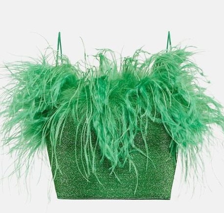 I PAIRED A GREEN TURBAN, WITH BROWN TORTOISE GLASSES, GREEN VINTAGE CHANDELIER EARRINGS, WITH AN OVERSIZED SAINT LAURENT, IVORY-CREAM BLAZER, OVER A SANDRO GREEN KNIT TOP, THAT WILL BE WORN TUCKED INTO THE SKIRT, AND WORN UNDERNEATH A OSEREE, GREEN LUMIERE FEATHER BOA CROP TANK TOP. THAT I PAIRED, WITH A DISTRESSED DENIM SKIRT, IVORY TIGHTS, AND PEACOCK BRIGHT GREEN PATENT PLATFORM ANKLE SANDALS. FOR THE ACCESORIES, I PAIRED A PEACOCK GREEN COPERNI MINI BAG. AND FOR THE JEWELRY, I PAIRED A GREEN TURQUOISE STONE CUFF BRACELET.