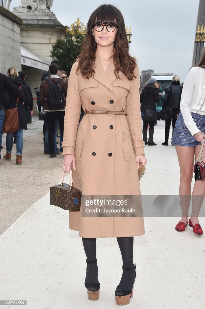 MIROSLAVA DUMA IS WEARING A BROWN TRENCH COAT, THAT SHE PAIRED WITH A LEATHER BROWN SKINNY BELT. SHE PAIRED HER TRENCH COAT, WITH BLACK TIGHTS, AND BLACK CORK PLATFORMS. FOR HER ACCESSORIES, SHE PAIRED ROUND BLACK OPTICAL FRAMES, AND A MINI LOUIS VUITTON TRUNK BAG.