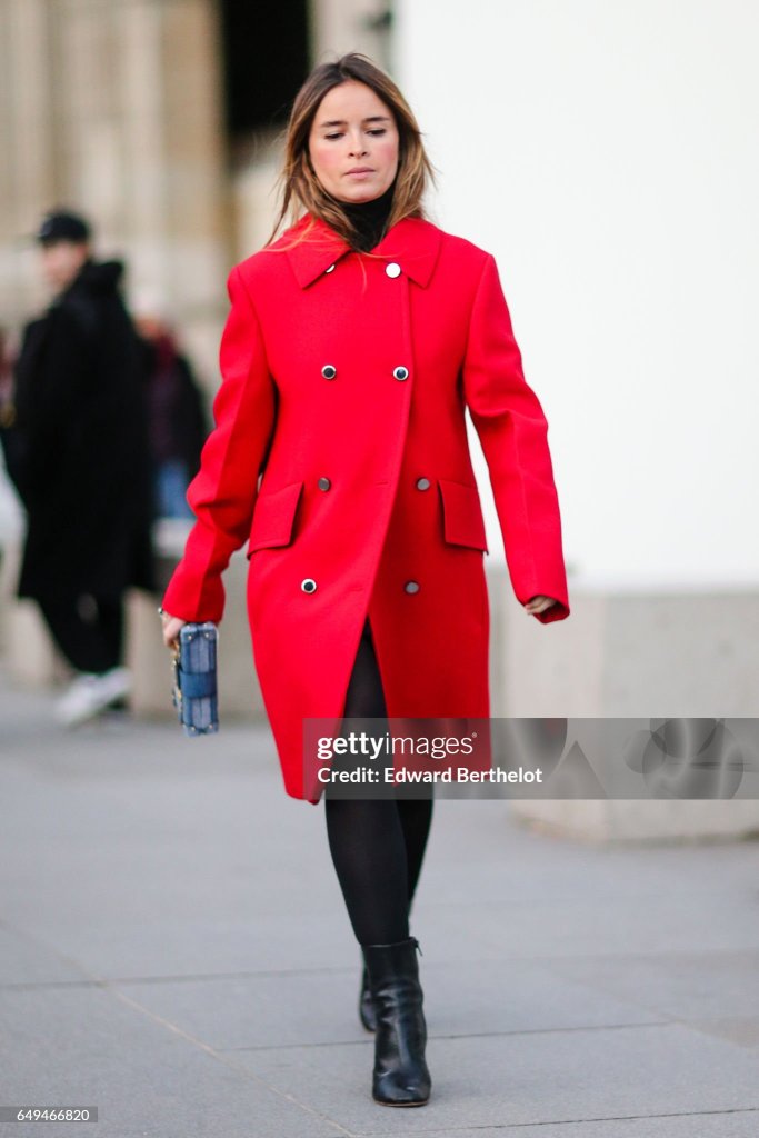 MIROSLAVA DUMA IS WEARING A RED BUTTON COAT, THAT SHE PAIRED OVER A BLACK TURTLENCK DRESS, SHE PAIRED HER COAT, THAT SHE IS WEARING LIKE A DRESS, WITH BLACK TIGHTS, AND BLACK ANKLE BOOTS. FOR HER ACCESSORIES, SHE PAIRED A BLUE BOX BAG, WITH HER OUTFIT. FOR A COMPLIMENTING COLOR, TO BRING TOGETHER, THE BOLD RED COAT, WITH THE AMBIANCE, OF THE REST OF THE OUTFIT. MY FAVORITE ELEMENTS, OF THIS OUTFIT, IS THE FACT THAT THE COAT, IS BEING WORN AS A DRESS, PAIRED WITH BOLD COLOR TIGHTS. SO, I DECIDED TO RECREATE THIS LOOK, OF THE BOLD COLOR COAT, BEING WORN AS A DRESS, PAIRED WITH TIGHTS.